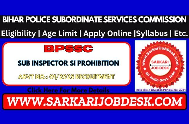 Bihar Police Subordinate Services Commission (BPSSC)Bihar Police BPSSC Sub Inspector SI Prohibition Recruitment 2025Bihar Police Sub Inspector Prohibition Advt No. : 01/2025 : Short Details of NotificationWWW.SARKARIJOBDESK.COM |