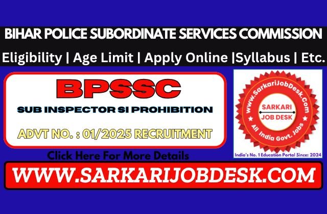 Bihar Police Subordinate Services Commission (BPSSC)Bihar Police BPSSC Sub Inspector SI Prohibition Recruitment 2025Bihar Police Sub Inspector Prohibition Advt No. : 01/2025 : Short Details of NotificationWWW.SARKARIJOBDESK.COM |
