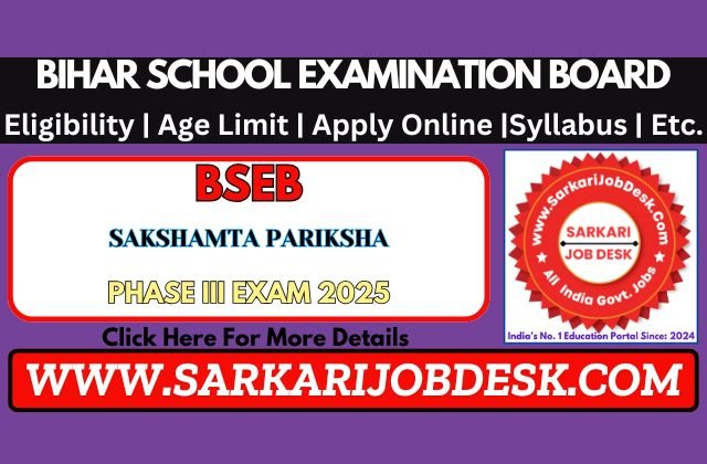 Bihar School Examination Board (BSEB)Bihar Sakshamta Pariksha Examination III (Third ) 2025Bihar Sakshamta Pariksha PR No 60/25: Short Details of NotificationWWW.SARKARIJOBDESK.COM |