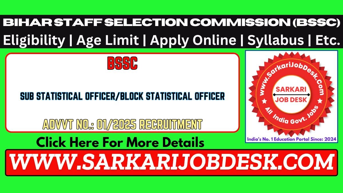 Bihar Staff Selection Commission BSSCBihar Sub Statistical Officer/Block Statistical Officer Recruitment 2025BSSC Advt No. : 01/2025 : Short Details of NotificationWWW.SARKARIJOBDESK.COM |