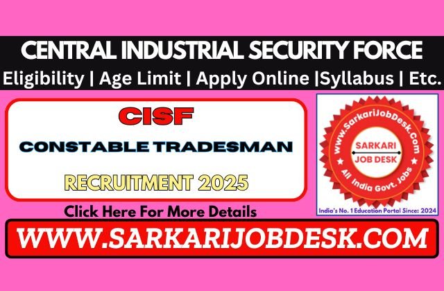 Central Industrial Security Force (CISF)CISF Constable Tradesman Recruitment 2024CISF Constable Tradesman Exam 2025 : Short Details of NotificationWWW.SARKARIJOBDESK.COM |