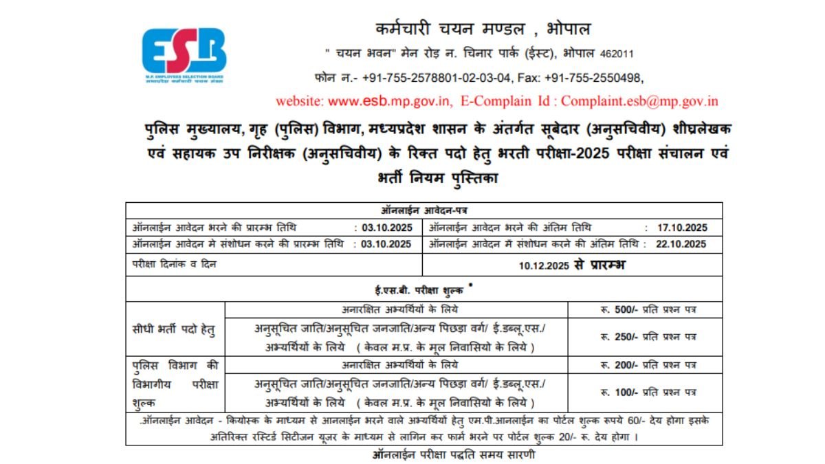Short Information : | Madhya Pradesh Employees Selection Board (MPESB) has released the official notification for the Police Subedar, Stenographer & ASI Ministerial Recruitment Test 2025. Interested candidates can apply online from 03 October 2025 to 17 October 2025. Candidates must check the full notification for eligibility, age limit, syllabus, and other important details before applying. |