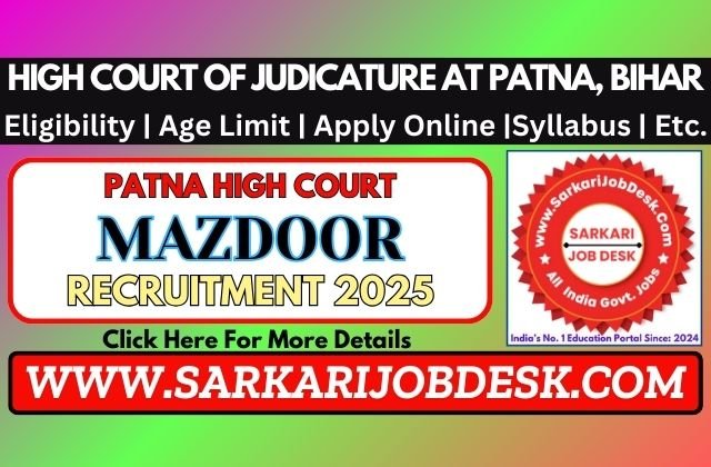 Short Information : | The High Court of Judicature at Patna, Bihar, has announced the Mazdoor Recruitment 2025 under Advertisement No. PHC/01/2025. Interested candidates can apply online from February 17, 2025, to March 18, 2025. To learn more about eligibility criteria, required qualifications, age limits, the selection process, and the detailed syllabus, refer to the official advertisement. |