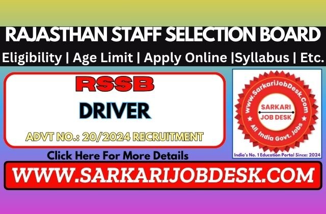 Rajasthan Staff Selection Board (RSSB) | RSMSSBRSMSSB Rajasthan DriverRecruitment 2025Rajasthan Driver Advt No. : 20/2024 : Short Details of NotificationWWW.SARKARIJOBDESK.COM |