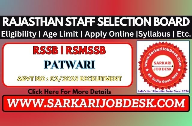 Rajasthan Staff Selection Board (RSSB) | RSMSSBRSMSSB Rajasthan Patwari Recruitment 2025Rajasthan Patwari Advt No. : 02/2025 : Short Details of NotificationWWW.SARKARIJOBDESK.COM |