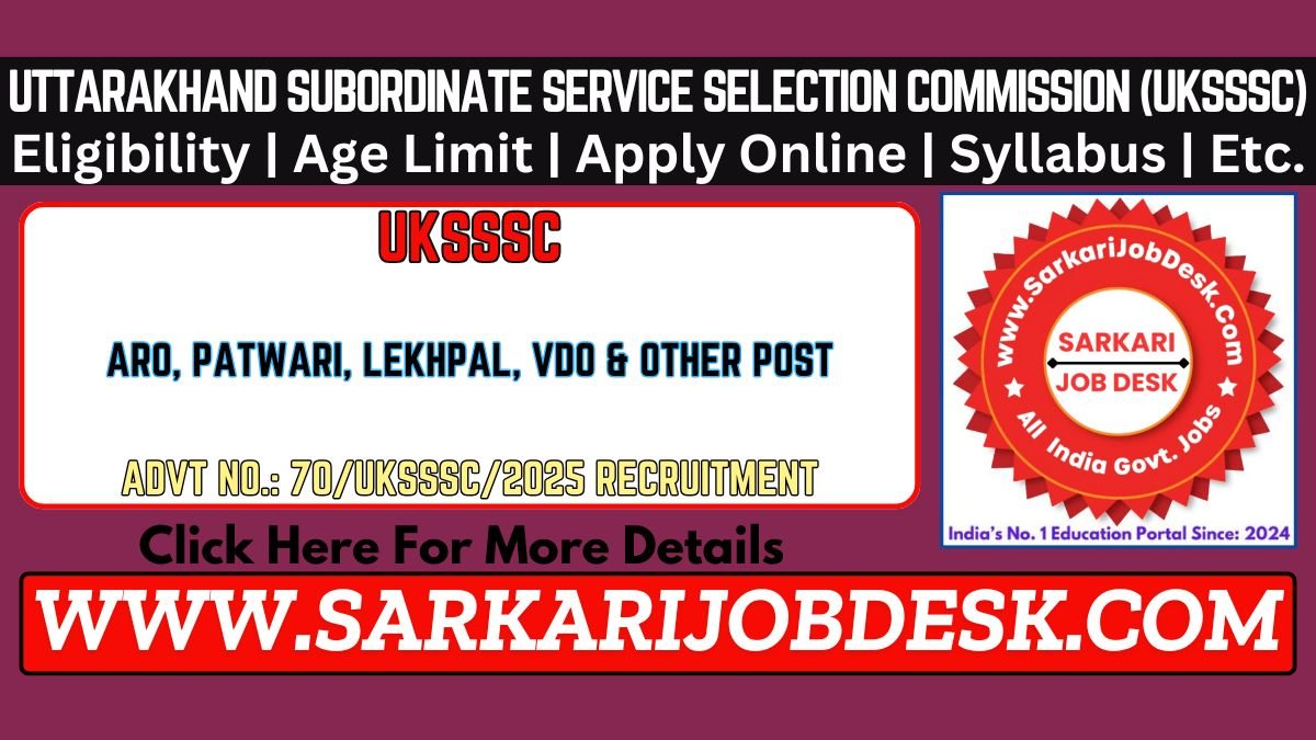 Uttarakhand Subordinate Service Selection Commission (UKSSSC)UKSSSC Group C Patwari, Lekhpal, VDO and Other Post Post Exam 2025UKSSSC Advt No. : 70/UKSSSC/2025 : Short Details of NotificationWWW.SARKARIJOBDESK.COM |