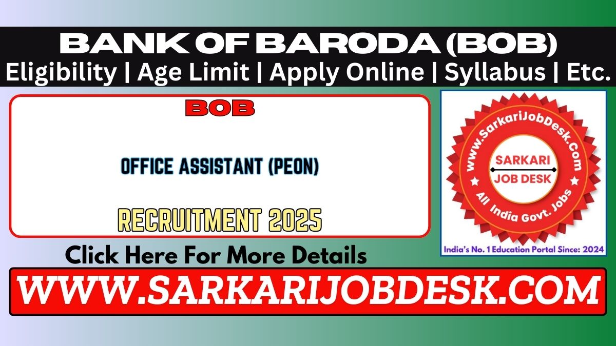 Bank of Baroda (BOB)Bank of Baroda (BOB) Office Assistant (Peon) Recruitment 2025BOB Peon Exam 2025 : Short Details of NotificationWWW.SARKARIJOBDESK.COM |