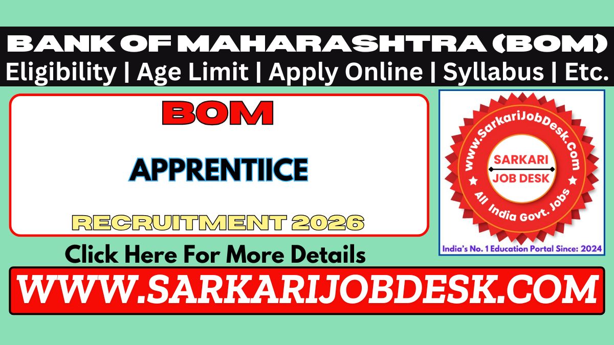 | Short Information : | Bank of Maharashtra (BOM) has released the official notification for Engagement of Apprentices under the Apprentices Act, 1961 (Project 2025–26). A total of 600 Apprentice posts are available. Eligible candidates can apply online from 15 January 2026 to 25 January 2026. Interested candidates must read the full notification carefully before applying online. |