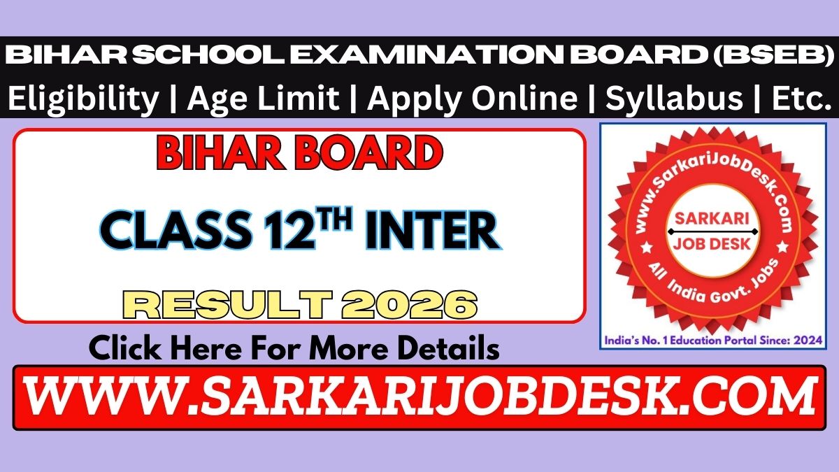 Bihar School Examination Board (BSEB)BSEB Bihar Board Class 12th Inter Result 2026Bihar Board BSEB XIIth Results 2026 : Short Details of NotificationWWW.SARKARIJOBDESK.COM |