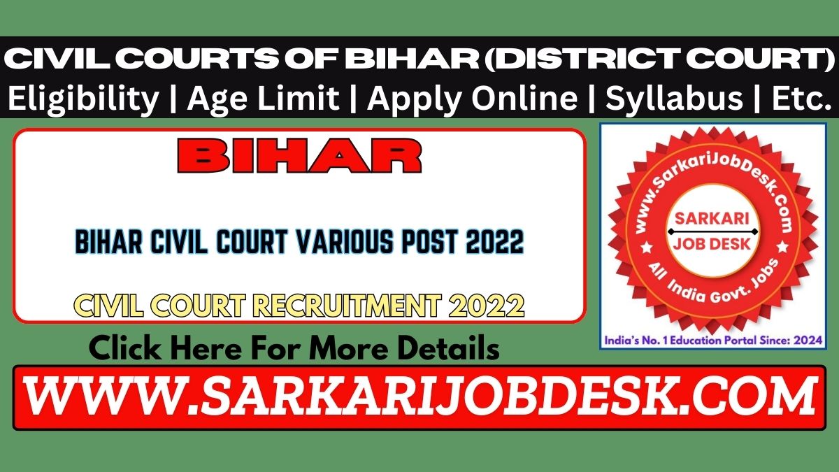Civil Courts of Bihar (District Court)Bihar Clerk | Stenographer | Court Reader | Peon Recruitment 2022Bihar Advt No.: 01-04/2022 : Short Details of NotificationWWW.SARKARIJOBDESK.COM |