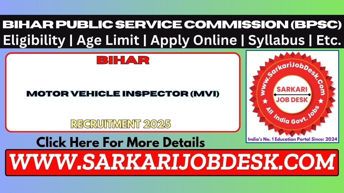 Bihar Public Service Commission (BPSC)BPSC Motor Vehicle Inspector (MVI) in Transport Dept. Recruitment 2025BPSC MVI Exam Advt No. : 41/2025 : Short Details of NotificationWWW.SARKARIJOBDESK.COM |
