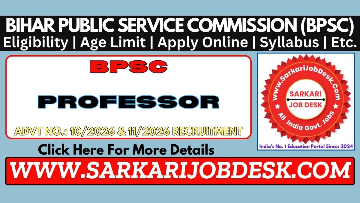 Bihar Public Service Commission (BPSC)BPSC Professor of Physics & Chemistry Recruitment 2026BPSC Professor Advt No. : 10-11/2026 : Short Details of NotificationWWW.SARKARIJOBDESK.COM |