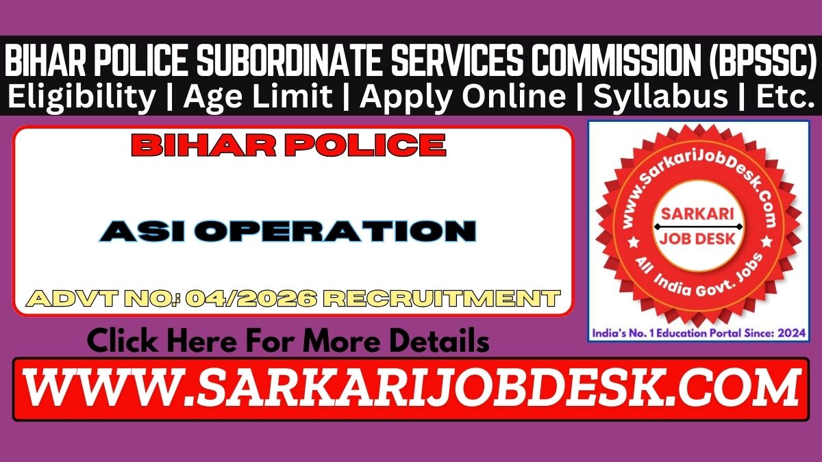 Bihar Police Subordinate Services Commission (BPSSC)Bihar Police BPSSC Assistant Sub Inspector ASI Operation Recruitment 2026Bihar Police ASI Operation Advt No. : 04/2026 Short Details of NotificationWWW.SARKARIJOBDESK.COM |