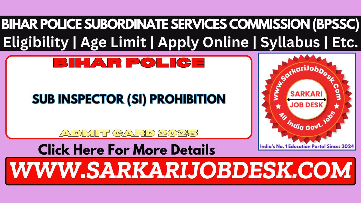 Bihar Police Subordinate Services Commission (BPSSC)BPSSC Sub Inspector (SI) Prohibition Recruitment 2025BPSSC Bihar Advt No.: 01/2025 : Short Details of NotificationWWW.SARKARIJOBDESK.COM |
