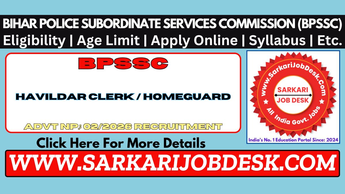 Bihar Police Subordinate Services Commission (BPSSC)BPSSC Bihar Home Guard Havildar Clerk Recruitment 2026BPSSC Advt No.: 02/2026 : Short Details of NotificationWWW.SARKARIJOBDESK.COM |