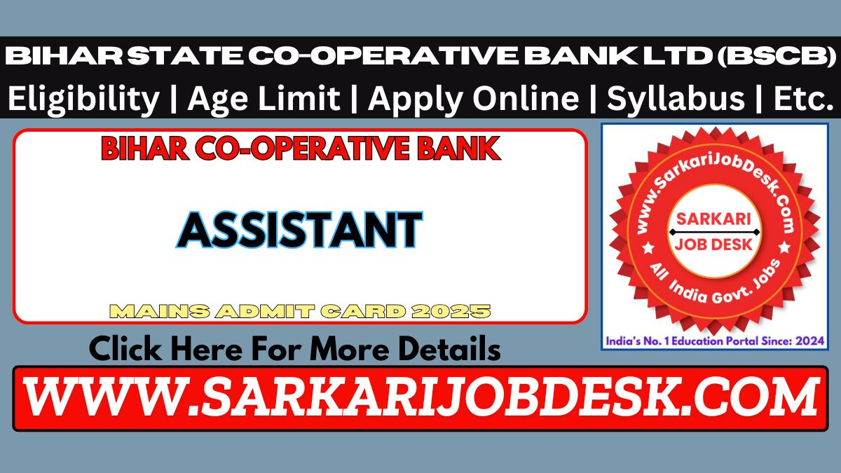 Bihar State Co-operative Bank Ltd (BSCB)Bihar State Co-operative Bank Ltd Recruitment 2025BSCB Assistant Vacancy 2025 : Short Details of NotificationWWW.SARKARIJOBDESK.COM |