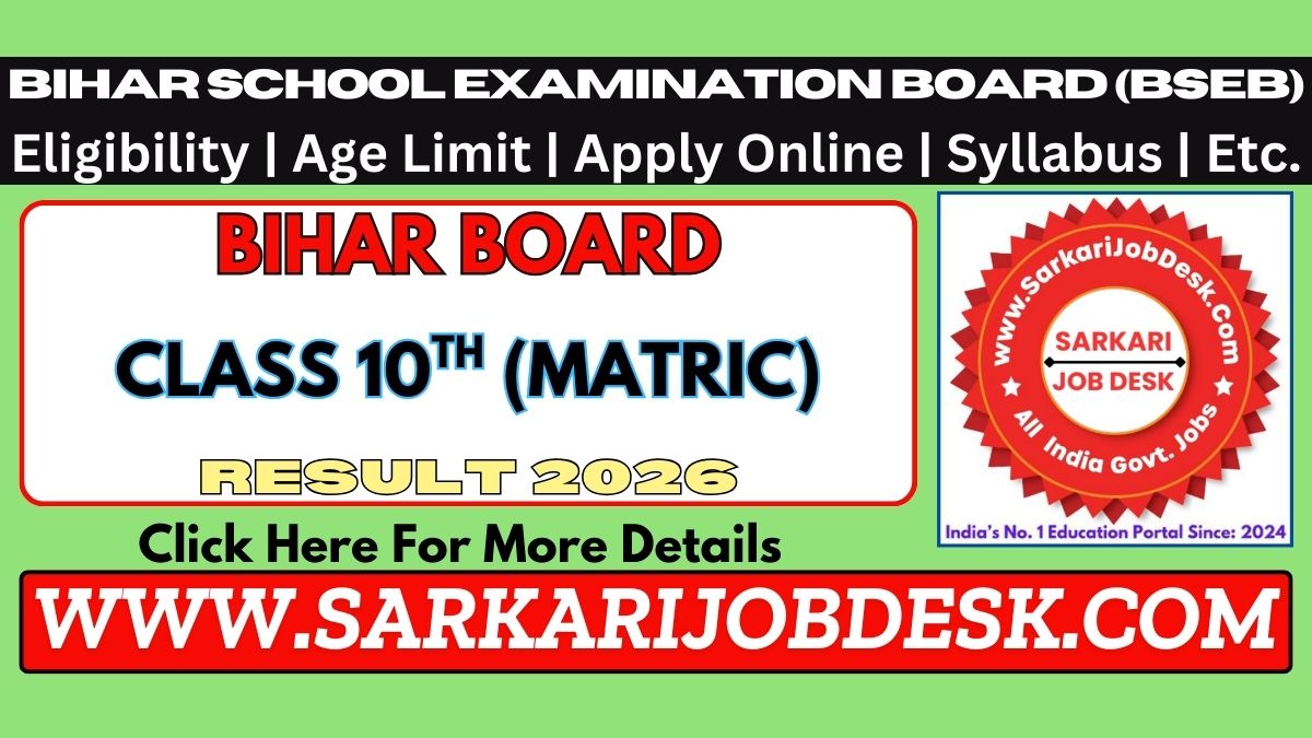 Bihar School Examination Board (BSEB)BSEB Bihar Board Class 10th Matric Result 2026Bihar Board BSEB Xth Results 2026 : Short Details of NotificationWWW.SARKARIJOBDESK.COM |