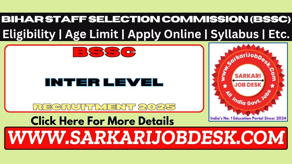 | Short Information : | Bihar Staff Selection Commission (BSSC) has released the official notification for Inter Level Recruitment 2025 on its official website. The online application form for BSSC Inter Level Various Posts 2025 has started from 15 October 2025 and will continue till 25 November 2025. Interested candidates can apply online and check eligibility, age limit, post details, syllabus, and other important information here. |