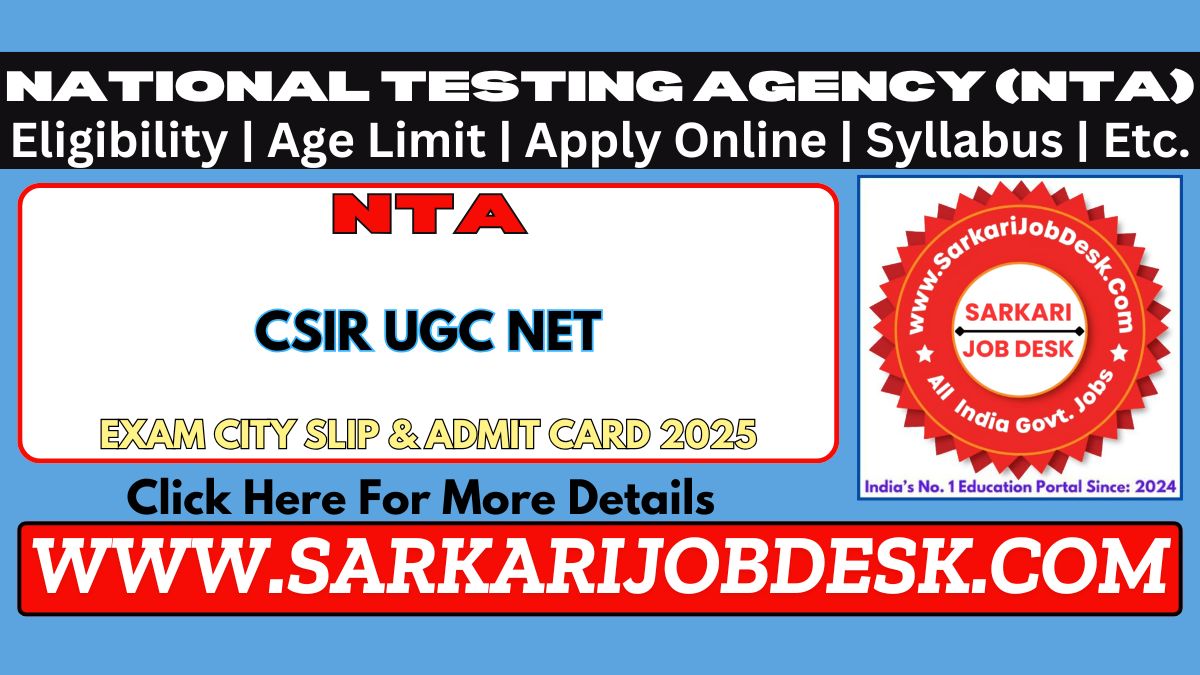 | Short Information : | National Testing Agency (NTA) has released the Exam City Slip / Admit Card for CSIR UGC NET December 2025. The exam will be conducted on 18 December 2025, and candidates can now download their exam city details from the link given below. |