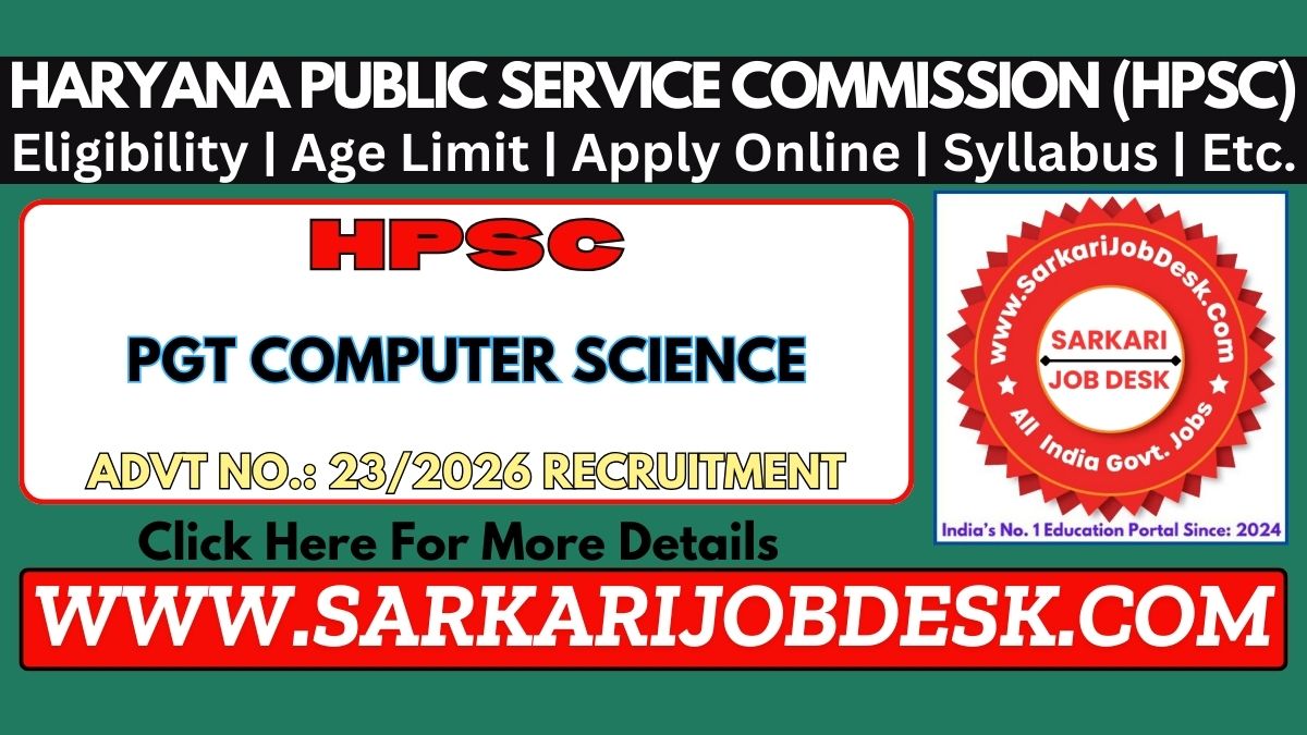 Haryana Public Service Commission (HPSC)Haryana Post Graduate Teacher (PGT) Computer Science Recruitment 2026HPSC PGT Advt No.: 23/2026 : Short Details of NotificationWWW.SARKARIJOBDESK.COM |
