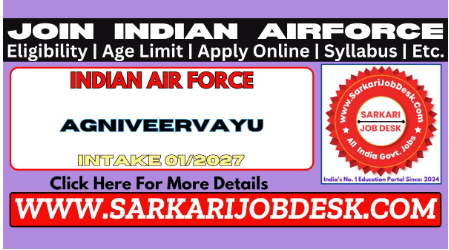 Join Indian Airforce Agnipath Vayu Agniveer SchemeIndian Airforce Agniveer Vayu Selection Test 2026Agniveer Vayu Intake 01/2027 : Short Details of NotificationWWW.SARKARIJOBDESK.COM |