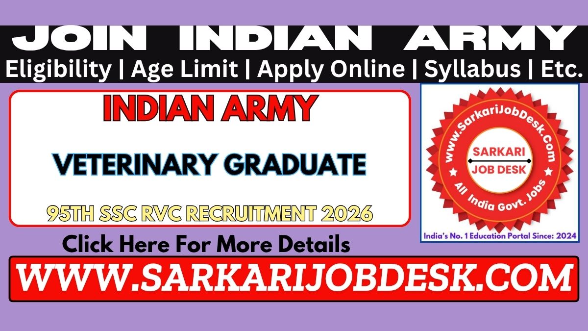 Indian Army SSC Veterinary Graduates Men & Women 95th 2026Join Indian Army SSC Veterinary Graduate SSC RVC Recruitment 2026Army 95th SSC RVC 2026 : Short Details of NotificationWWW.SARKARIJOBDESK.COM |