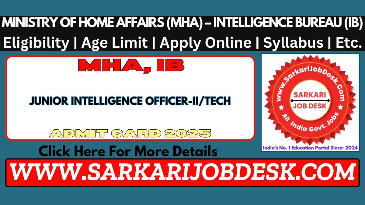 Short Information : | Ministry of Home Affairs MHA - Intelligence Bureau (IB) has released the notification for Junior Intelligence Officer-II/Tech (JIO-II/Tech) Recruitment 2025. Candidates who applied for the IB JIO-II/Tech 2025 exam can now check their Exam City details and Admit Card from the official website. Read the full notification for eligibility, age limit, syllabus, selection process, and salary details. |