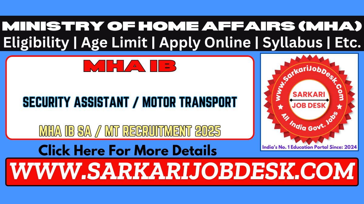 Ministry of Home Affairs (MHA)MHA IB Security Assistant SA / MT Recruitment 2025MHA IB SA / MT Exam 2025: Short Details of NotificationWWW.SARKARIJOBDESK.COM |