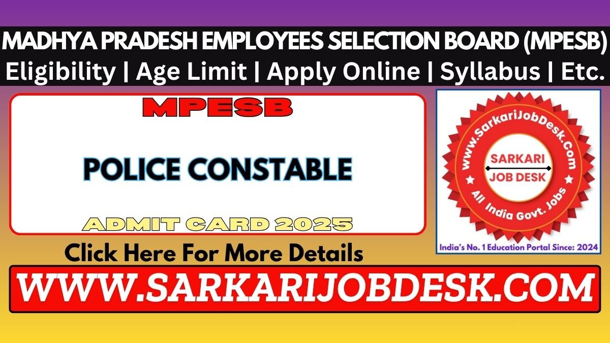 Madhya Pradesh Employees Selection Board (MPESB)Madhya Pradesh MP Police Constable Admit Card 2025MPESB Police Constable Exam 2025 : Short Details of NotificationWWW.SARKARIJOBDESK.COM |