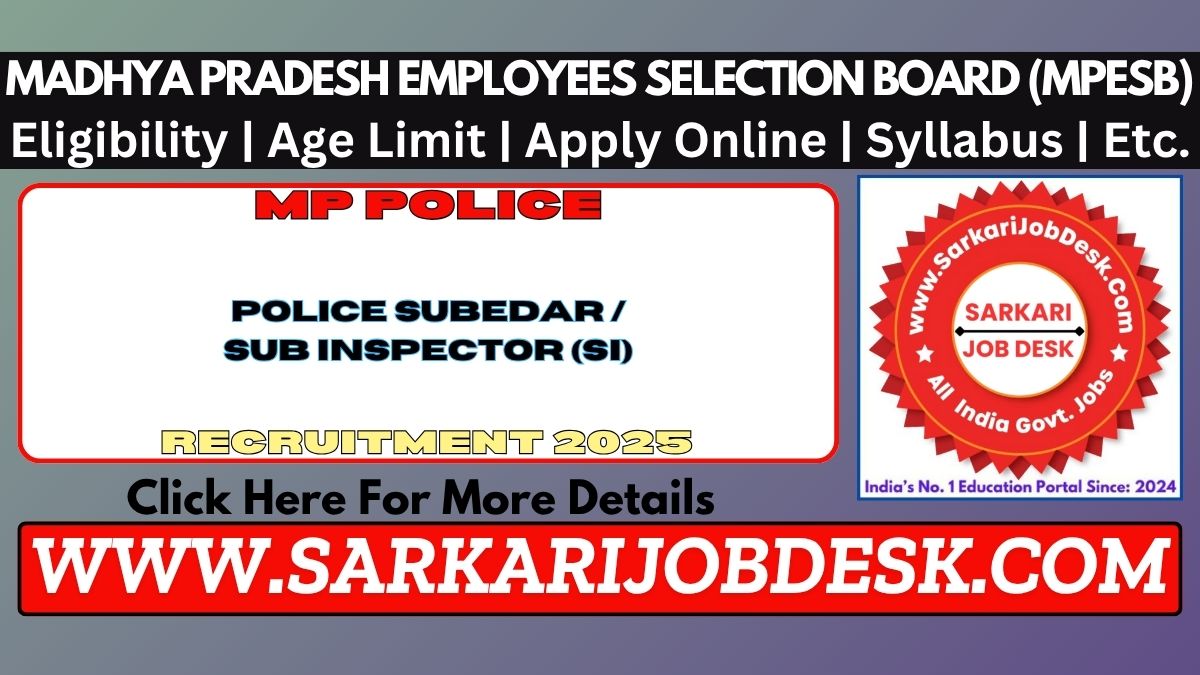 Madhya Pradesh Employee Selection Board (MPESB)MPESB MP Police Subedar, Sub Inspector (SI) Recruitment 2025MPESB Police SI Exam 2025 : Short Details of NotificationWWW.SARKARIJOBDESK.COM |