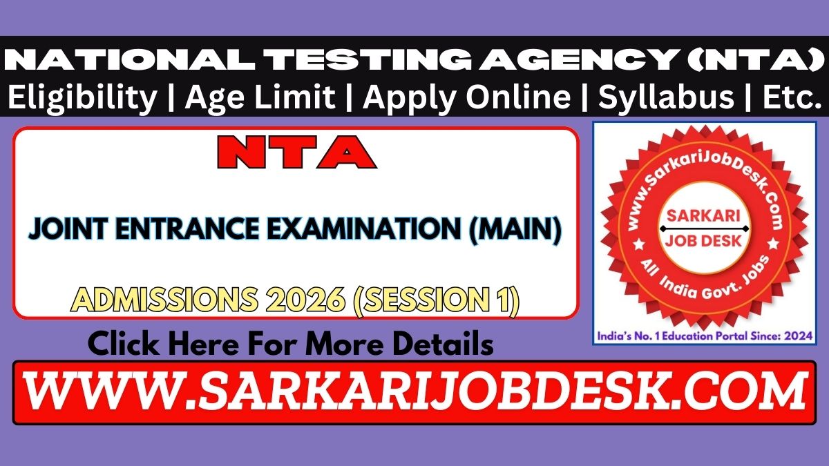 National Testing Agency (NTA)NTA Joint Entrance Examination Main 2026 Session 1JEEMAIN January 2026 Exam : Short Details of NotificationWWW.SARKARIJOBDESK.COM |