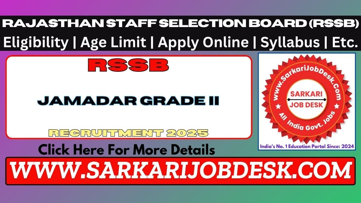 | Short Information : | Rajasthan Staff Selection Board (RSSB) has released the official notification for RSSB Jamadar Grade II Recruitment 2025. Interested and eligible candidates can apply online for 72 vacancies from 17 October 2025 to 15 November 2025 through the official website. Check complete details including eligibility, age limit, application fees, and selection process below. |
