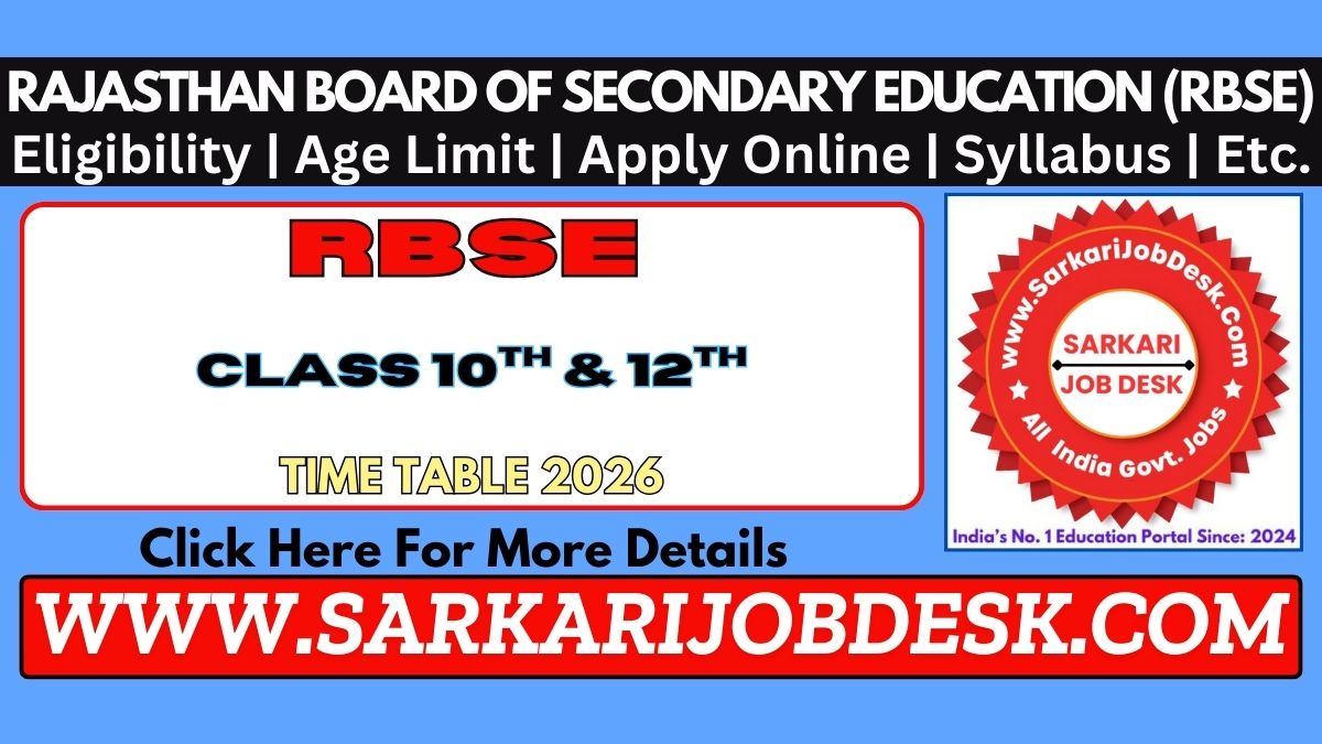 Rajasthan Board of Secondary Education (RBSE)Rajasthan Board RBSE Class 10 & 12 Time Table Released 2026RBSE Class 10 & 12 Exam 2026 : Short Details of NotificationWWW.SARKARIJOBDESK.COM |