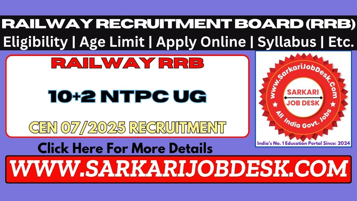 Railway Recruitment Board (RRB)RRB NTPC 10+2 Under Graduate Level Recruitment 2025RRB NTPC UG Exam 2026 CEN 07/2025 : Short Details of NotificationWWW.SARKARIJOBDESK.COM |