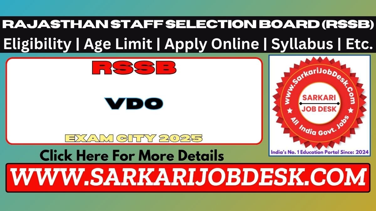 | Short Information : | Rajasthan Staff Selection Board (RSSB) has released the notification for the recruitment of Village Development Officer (VDO) under Advt. No. 03/2025 for 850 posts. The Exam City and Admit Card 2025 have been released. Candidates enrolled in the vacancy can download their exam city details and admit card from the official website. Read the full notification for eligibility, age limit, syllabus, exam date, and other information. |