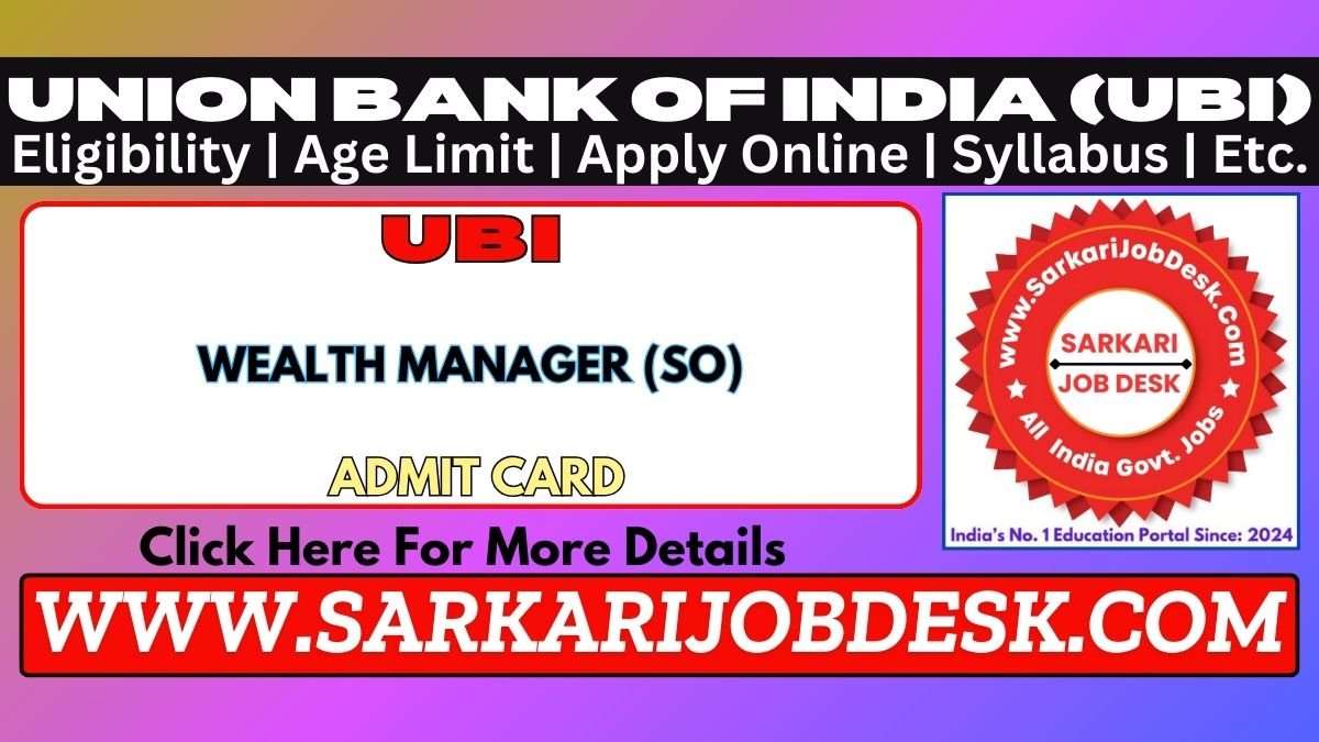 Union Bank of India (UBI)UBI Wealth Managers (Specialist Officers) Recruitment 2025UBI Wealth Manager (SO) Admit Card 2025 : Short Details of NotificationWWW.SARKARIJOBDESK.COM |
