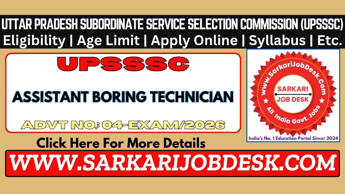 Uttar Pradesh Subordinate Service Selection Commission (UPSSSC)Uttar Pradesh UPSSSC UP Assistant Boring Technician Recruitment 2026 Mains ExamUPSSSC Advt No.: 04-Exam/2026 : Short Details of NotificationWWW.SARKARIJOBDESK.COM |