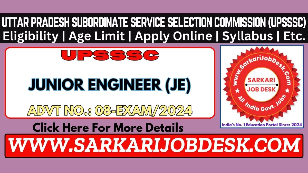 Uttar Pradesh Subordinate Service Selection Commission (UPSSSC)UPSSSC Junior Engineer (JE) Civil Recruitment 2024 Mains ExamUPSSSC JE Civil Advt No.: 08-Exam/2024 : Short Details of NotificationWWW.SARKARIJOBDESK.COM |
