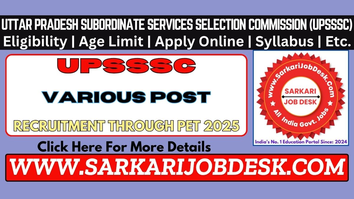 Uttar Pradesh Subordinate Services Selection Commission (UPSSSC) Govt. Of Uttar PradeshUPSSSC Latest / Upcoming Recruitment 2026 Through PET 2025UPSSSC Latest Vacancy 2026 : Short Details of NotificationWWW.SARKARIJOBDESK.COM |