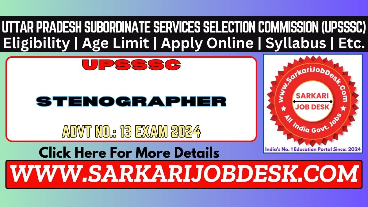 Uttar Pradesh Subordinate Service Selection Commission (UPSSSC)Uttar Pradesh UPSSSC Stenographer Recruitment 2024 Mains ExamUPSSSC Steno Advt No. : 13-Exam/2024 Short Details of NotificationWWW.SARKARIJOBDESK.COM |